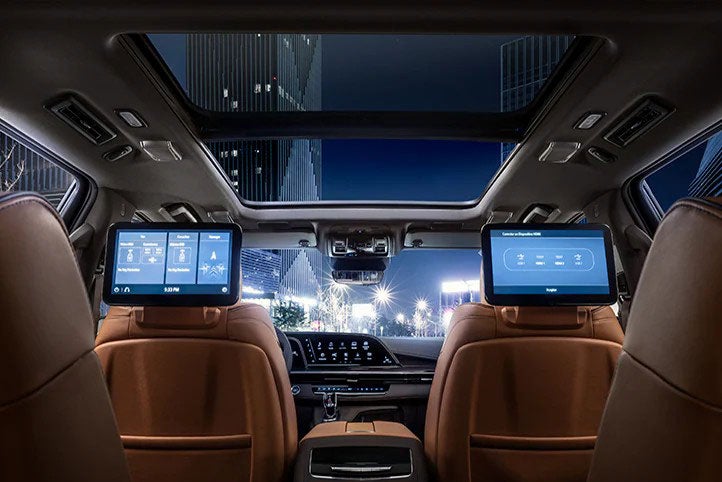 Sistema de entretenimiento trasero, 2 pantallas de 12.6” HD en la segunda fila de asientos con dos puertos HDMI y USB-C para reproducir de forma independiente o desde algún otro dispositivo.
