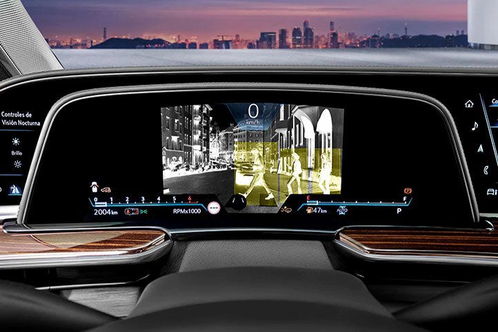 Con tecnología infrarroja, refleja la imagen en el panel de instrumentos de 14.2” para mejorar la visibilidad frontal, incluida la detección de peatones.